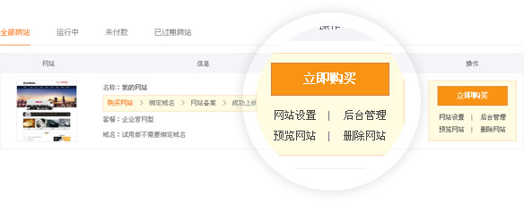 4.【预览网站】:点击后可预览试用中的站点5.【删除网站】:点击后可删除试用中的站点